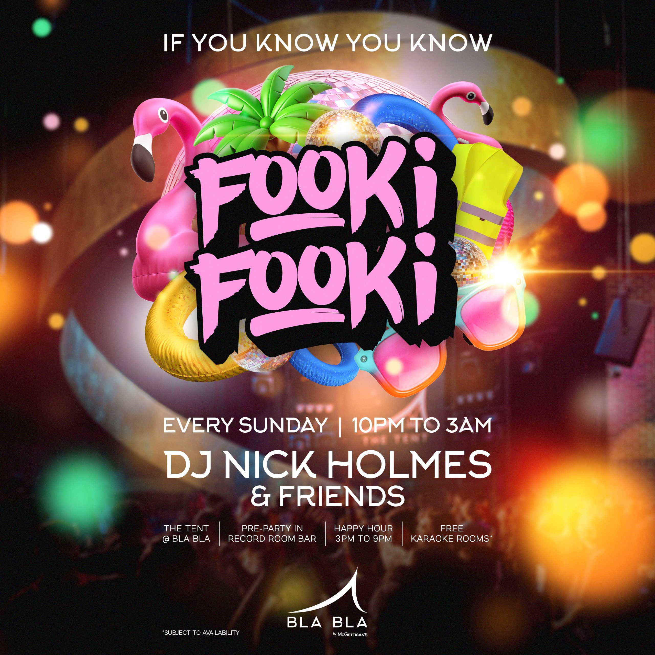 Fooki Fooki takes over The Tent every Sunday from 10pm, DJ Nick Holmes & Friends, pre-party vibes, and 3 drinks for AED 100 (10pm to 12am).